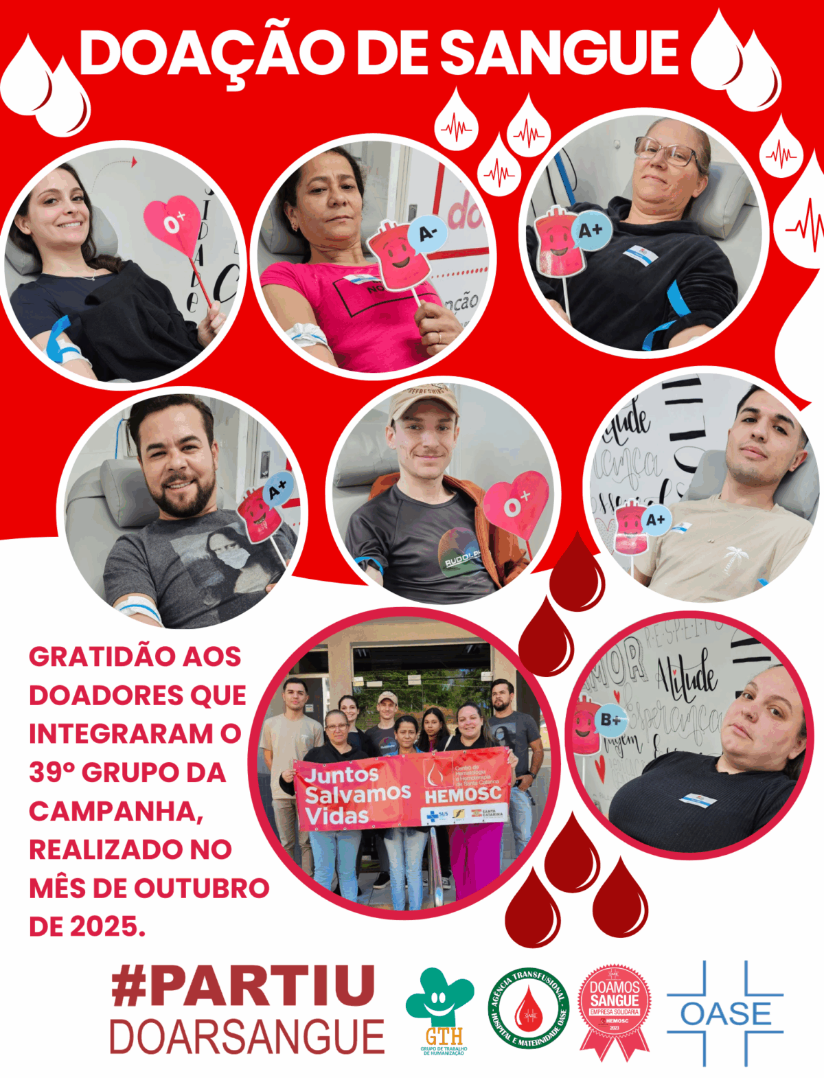 Mensalmente, o hospital organiza grupos de voluntários que se deslocam até o Hemosc de Blumenau, reforçando os estoques de sangue e garantindo segurança para procedimentos cirúrgicos, partos, atendimentos de urgência e pacientes em tratamento contínuo. No dia 14 de outubro de 2025, o Oase conduziu o 39º grupo de doadores, formado por colaboradores, familiares, acadêmicos e moradores da região, todos movidos por um mesmo ideal: doar vida.