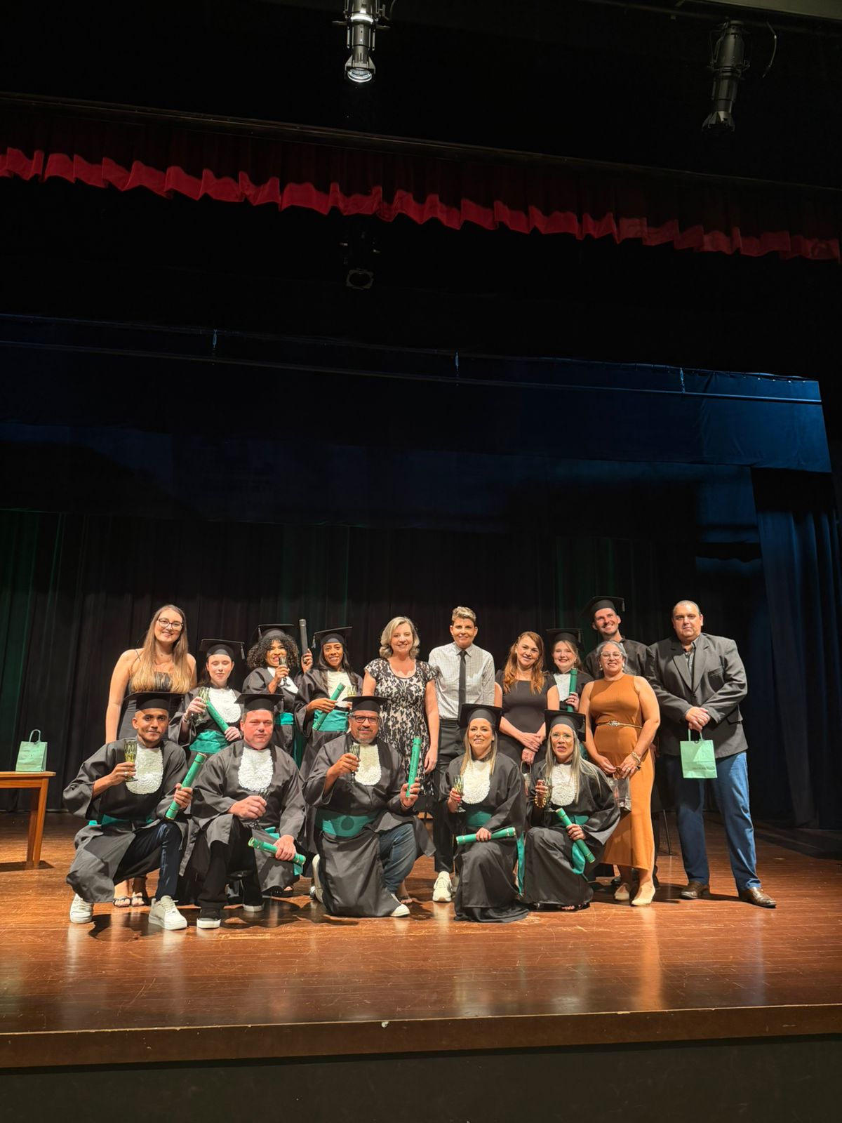 A solenidade seguiu com a entrega dos diplomas, realizada pela diretora Nathalie Graciele Souza, juntamente com a coordenadora Rosana Eli de Souza, celebrando oficialmente a conclusão do curso pelos novos técnicos em enfermagem.