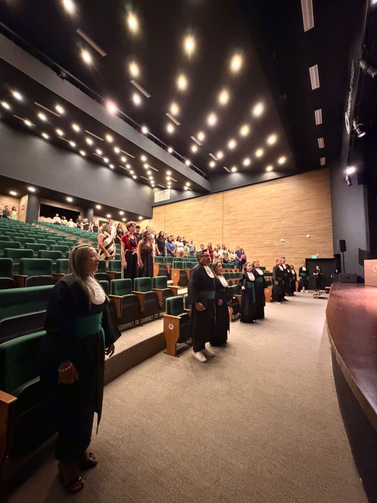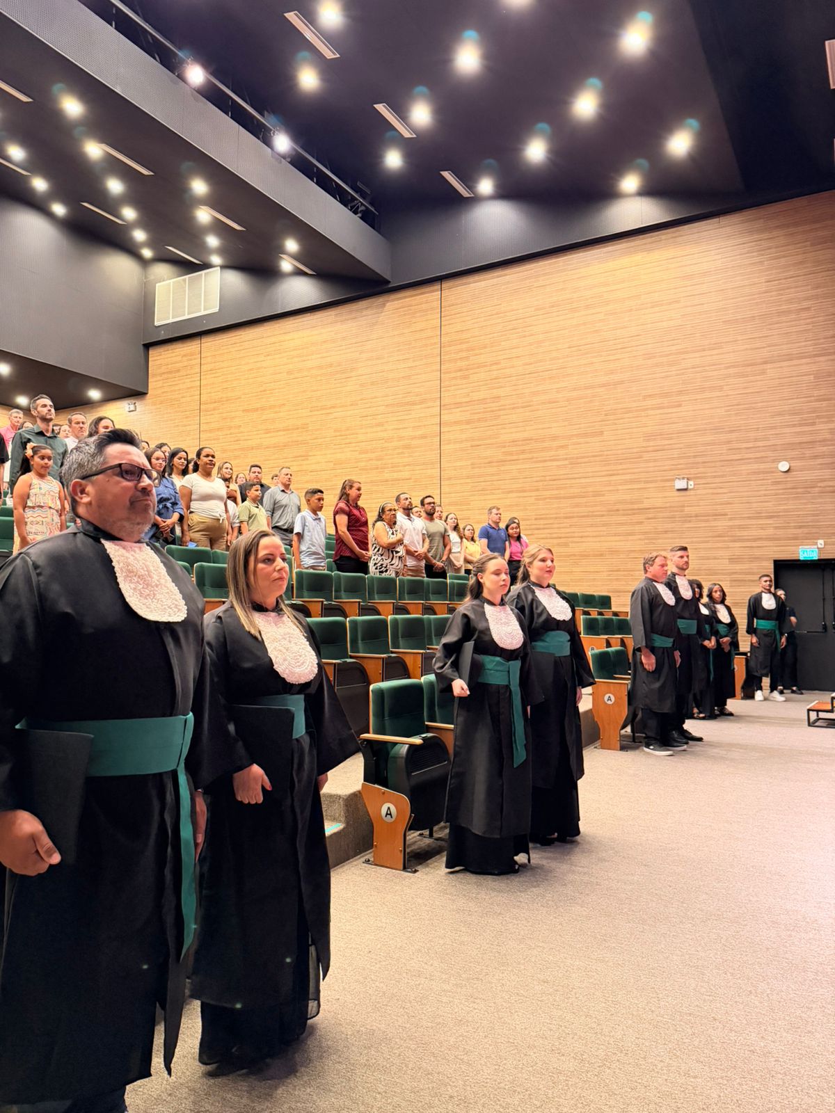 Com o auditório repleto de familiares e convidados, os formandos da Turma 07 foram convidados a ocupar seus lugares de honra, marcando oficialmente o início de uma solenidade repleta de significado. Em seguida, todos foram convidados a permanecer em pé para a execução do Hino Nacional Brasileiro, um momento de respeito e celebração que antecedeu os atos oficiais da cerimônia.