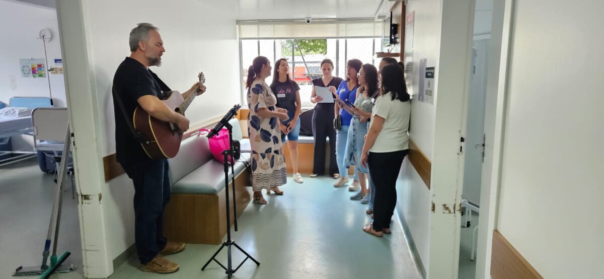 A ação integra o Projeto EnCantar, realizado em parceria com a Fundação de Cultura de Timbó, e carrega uma missão sensível e profundamente humana: permitir que a música seja ponte entre o cuidado técnico e o cuidado emocional, entre a ciência e a sensibilidade. Iniciando pelo refeitório e passando por diversos setores do hospital, o professor, com seu violão, e as alunas levaram mensagens em forma de canção, transitando pela MPB e por músicas natalinas, espalhando afeto por onde passavam.