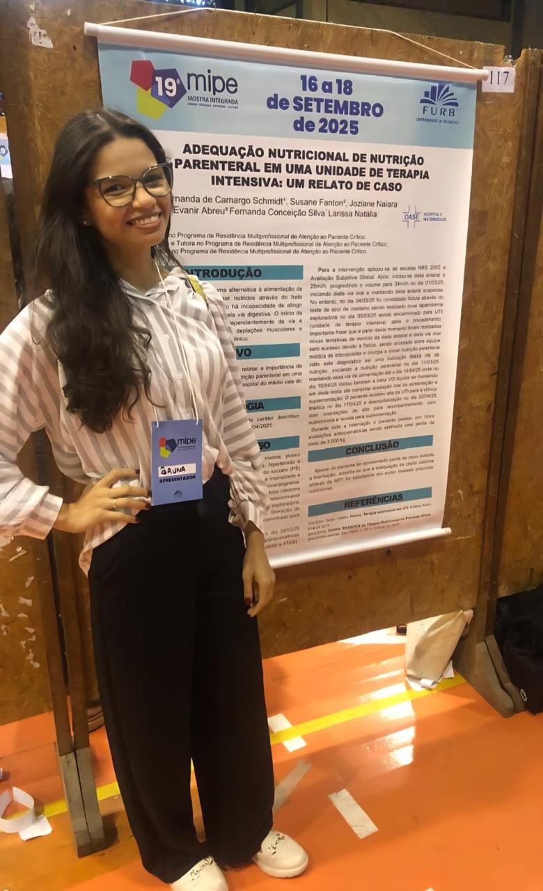 A residente em Nutrição, Bruna Fernanda de Camargo Schmidt, compartilhou o estudo “Adequação Nutricional de Nutrição Parenteral em Unidade de Terapia Intensiva”, destacando a importância da nutrição segura e individualizada no processo de recuperação.