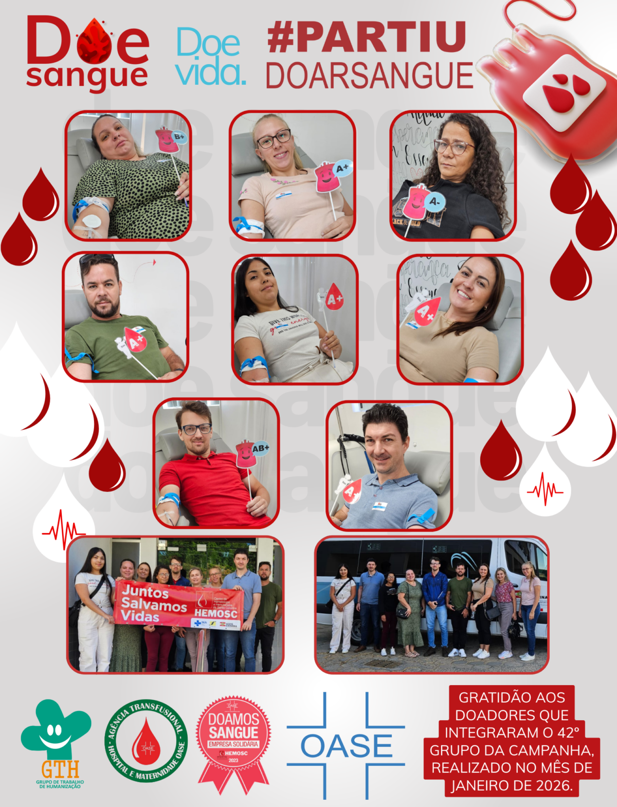 No dia 20 de janeiro, em parceria com a Secretaria Municipal de Saúde, o Hospital Oase conduziu o 42º grupo de doadores voluntários ao Hemosc. Na data, o cenário dos estoques de concentrado de hemácias na Hemorrede indicava níveis adequados para AB- e AB+, estáveis para A+, B-, B+ e O+, e reduzidos para O- e A-, reforçando a importância contínua da doação. Entre os voluntários do grupo, as tipagens sanguíneas registradas foram B+, A-, A+ e AB+.