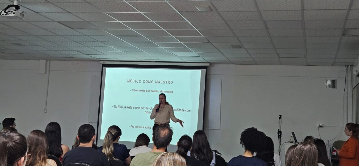 Na sequência, a residente dra. Maria Eugênia Rocha apresentou os resultados do primeiro ano de funcionamento da Unidade de AVC, evidenciando melhorias no fluxo de atendimento e no acompanhamento pós-alta. São números que representam histórias reais de recuperação, autonomia e novas oportunidades de recomeço.