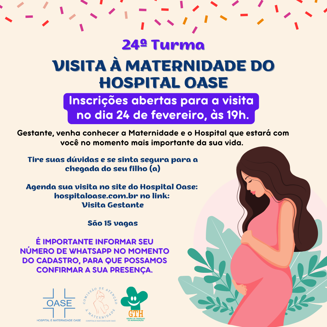 O Hospital e Maternidade Oase, por meio da Comissão de Atenção à Maternidade, realiza no dia 24 de fevereiro, às 19h, mais uma edição da Visita à Maternidade, iniciativa voltada à orientação de gestantes e acompanhantes, com foco na segurança, no acolhimento e na informação qualificada para o momento do nascimento.